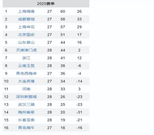 中超最新积分榜