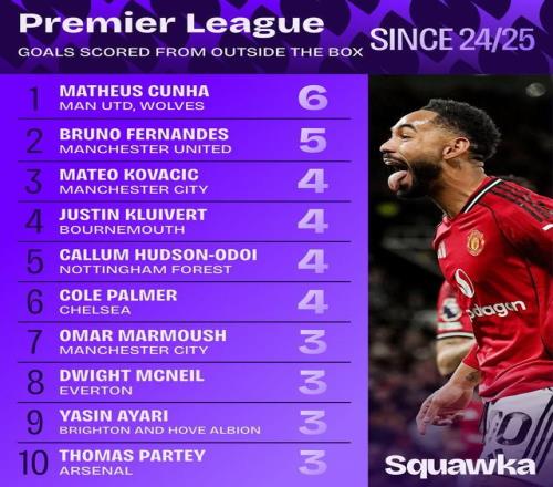 上赛季至今英超禁区外进球球员榜:库尼亚6球领跑,B费5球第二