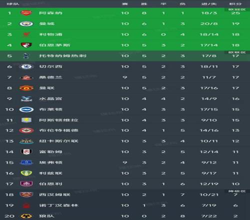 热刺、切尔西、桑德兰和曼联的积分都是17分暂列第5-第8名,热刺本轮0-1不敌切尔西,桑德兰本轮的比赛还没有进行,对手是埃弗顿,曼联三连胜脚步被终结,2-2和诺丁汉森林握手言和。水晶宫16分暂列第9名。阿斯顿维拉和布伦特福德都是15分暂列第10和第11名。