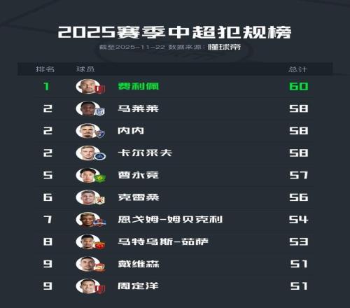 2025中超犯规榜:费利佩60次第一,马莱莱、内内58次并列第二