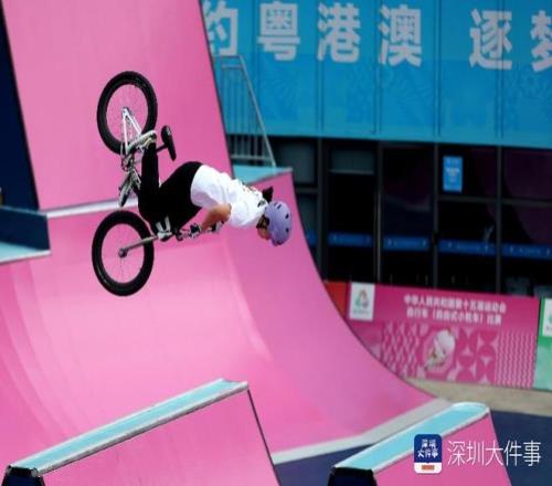 2025年10月25日,十五运会男子自由式公园赛决赛,广东队卢畅在完成动作后激动地把自行车甩向空中。