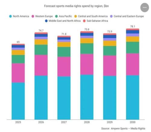 支撑这一预测的基础来自北美市场,自2025-26赛季开始,迪士尼旗下的ESPN和AT&T每年合计为NBA版权支付27亿美元,而2029年MLB也将开启新的转播周期,苹果预期将加入争夺新周期MLB的流媒体版权,涨价几乎板上钉钉。此外,普遍被认为价值低估的NFL在2026年也有望开启新周期版权谈判,达成一份更高价值的转播协议也是市场预期的结果。 Ampere在报告中预测,北美将从2025年的318亿增长至2030年的380亿美元,占据全球总预计增幅的47.7%。