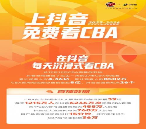 CBA联赛官方内容平台抖音首周战报来啦!从12月12日CBA揭幕战开始,抖音全程播出了过去一周的27场常规赛,累计观看人次4.36亿,累计观看人数8502万。CBA首周短视频总播放量超8亿,抖音全国榜热点26个。在抖音沉浸式看CBA!赛事球星热点内容一网打尽,更有超多大咖达人陪你看球,看比赛,“购”精彩!