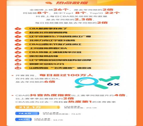 CBA官方首周收视战报:抖音平台累计观看人次4.36亿,累计观看人数8502万