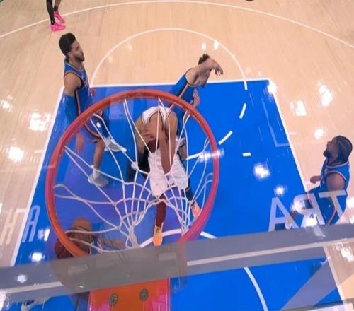 本来这球文班这个位置抢下前场板,可以直接发动进攻了,可是没想到亚历山大又来了一个新动作,叫夹腿动作,这个动作非常凶狠,夹着你的腿,那你能动吗?这种夹腿直接把人放倒,我们在之前的比赛里基本上都是看不见的,更不要说当家核心球员亲自去这么干,结果没有想到亚历山大,竟然真的亲自去这么干了。对对手超巨用剪刀腿,放在哪个联赛里都是不能被允许的。