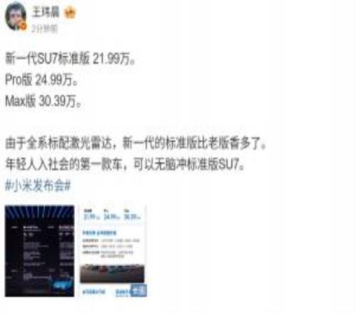 电竞体育3月19报道 小米春季新品发布会,新一代SU7正式登场,其中标准版21.99万,Pro版24.99万,MAX版30.39万。